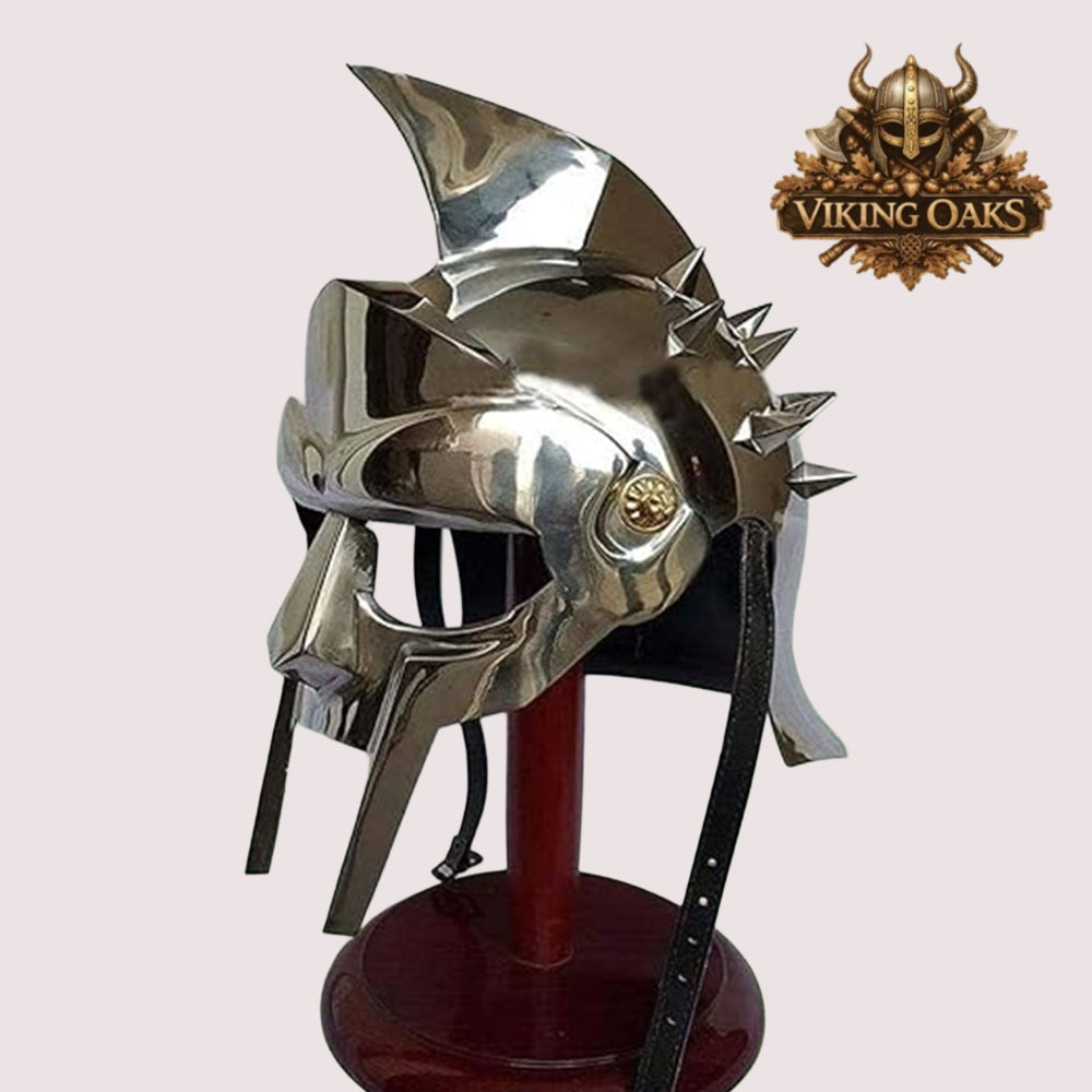 This Special Edition Gladiator Maximus Helmet is a bold and striking piece, designed with 25 spikes to deliver an authentic warrior look inspired by classic gladiator armor. Handcrafted with precision, it combines durability with impressive visual appeal—perfect for both wear and display.
